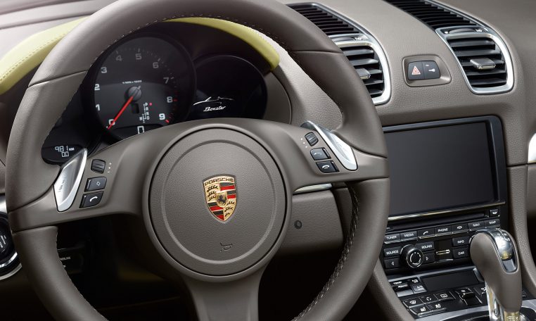 Power is transmitted to the road by 18-inch Boxster wheels. Their distinctive five-spoke design affords an unobstructed glimpse of the braking system’s black four-piston aluminium monobloc fixed calipers. And you can keep an eye on the pressure in all four tyres thanks to tire pressure monitoring (TPM). The large air inlets illustrate character. The sound produced by the central tailpipe in brushed stainless steel is unmistakably Porsche.